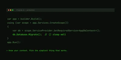 On Database.Migrate() in Program.cs in production, knowing your context, and picking the simplest thing that works.
