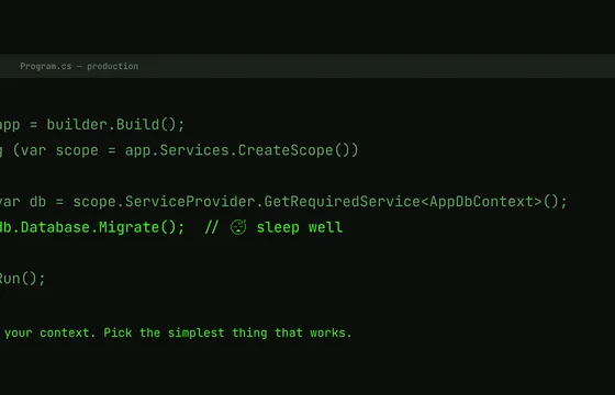 On Database.Migrate() in Program.cs in production, knowing your context, and picking the simplest thing that works.